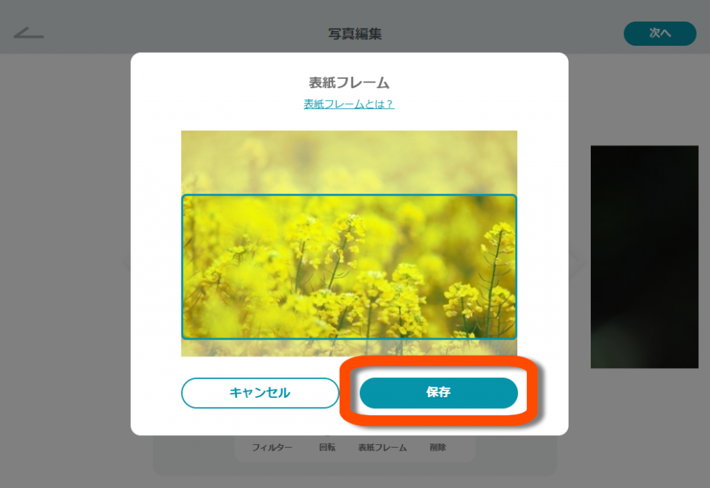 写真を選択し「表紙フレーム」のアイコンをクリックする
